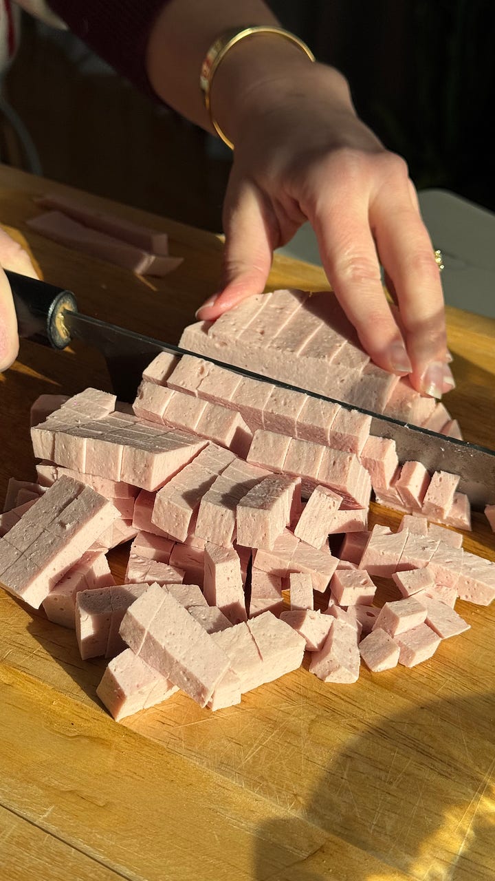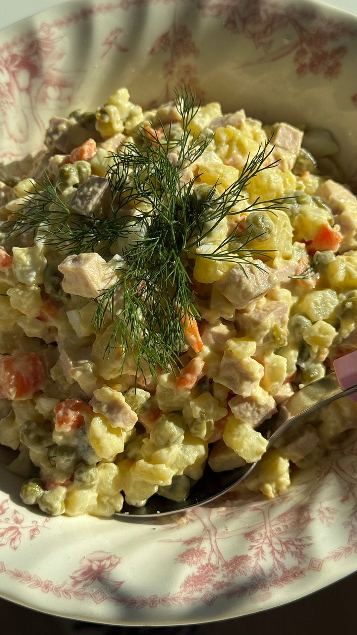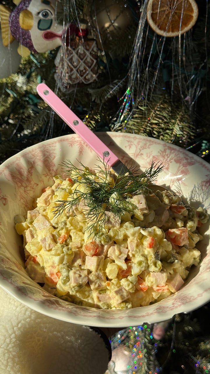 and I mean, no NYE is complete without olivye. it’s pretty much an eastern european version of potato salad. every house makes it different but the one non negotiable for me is the bologna. it’s called “baby bologna” - but if you don’t have a russian grocer near you then I think mortadella would make a good substitute. just ask your deli guy to cut you a slab instead of slices so you can dice it. many houses do chicken or beef but personally and respectfully I don’t fuck with that in my olivye. I feel like the softness of the bologna is cruciaallll.