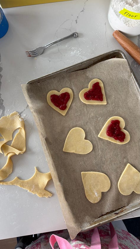 leftover dough scraps do in fact work magnificently as repurposed mini heart shaped pop tarts. just make sure to not overfill them and really close them shut!