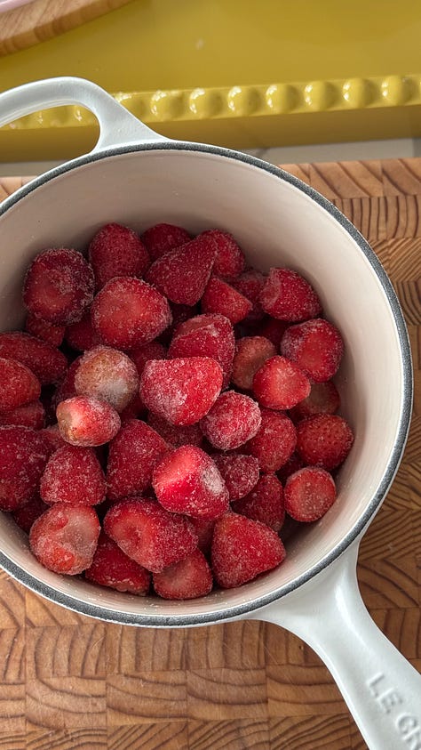 cook over medium heat, stirring, until fully thawed and beginning to bubble, 8-10 minutes. mash strawberries lightly with a fork or against the side of the pot, leaving some texture. continue to simmer for another 15-20 minutes until noticeably reduced and glossy.