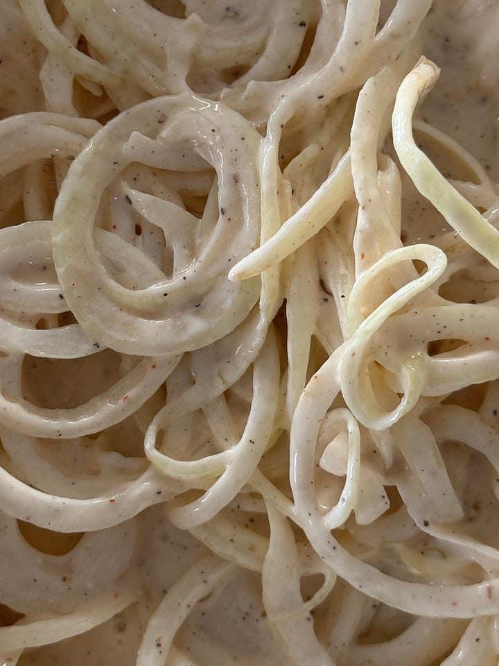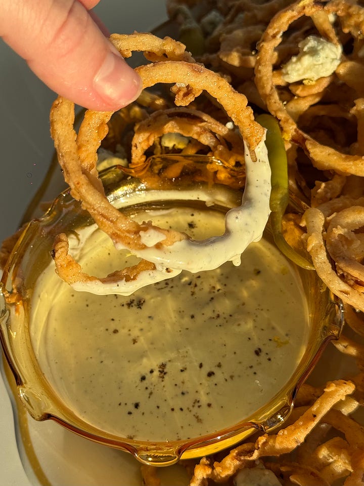 but what I lack in years of watching experience, I make up for in finger food passion. this year I was really drawn to onion rings, specifically shoestring. shoestring fries are my favorite style of fry because you don’t just eat one, you eat a pinch at a time, dunked in sauce and it’s great. so why not the same for onion rings you feel me. no accidentally eating the entire ring of onion from the inside the breading here - humiliation ritual. paired with a blue cheese aoiliiiiiiiiiiii yuhhhhh!