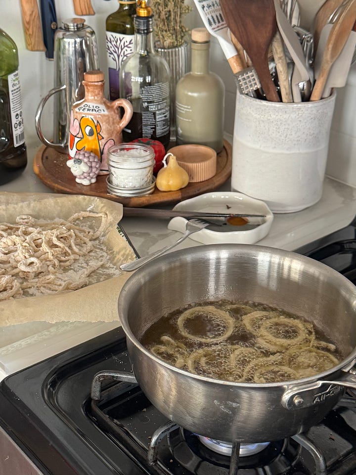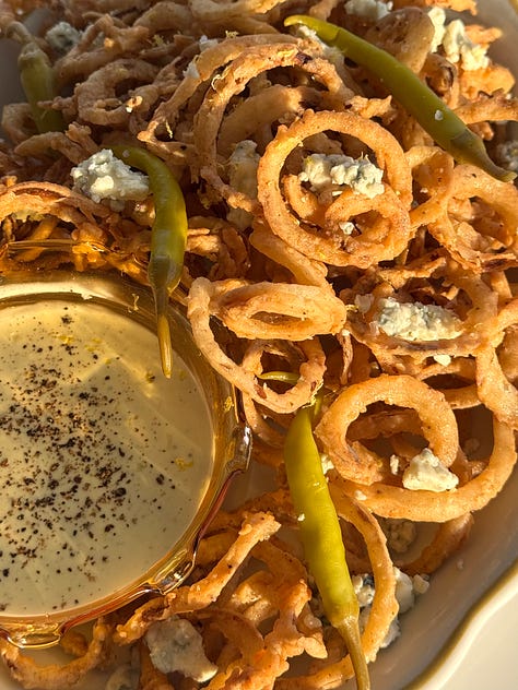 + a recipe for shoestring onion rings with blue cheese